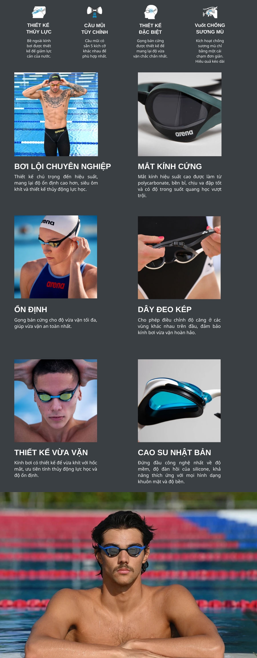- Thiết kế kính thủy động học: Giảm lực cản nước tối đa, giúp bơi nhanh hơn.