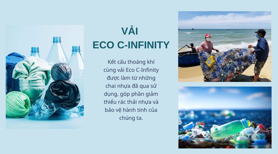 - Kết cấu thoáng khí cùng vải Eco C-Infinity được làm từ những chai nhựa đã qua sử dụng, góp phần giảm thiểu rác thải nhựa và bảo vệ hành tinh của chúng ta.