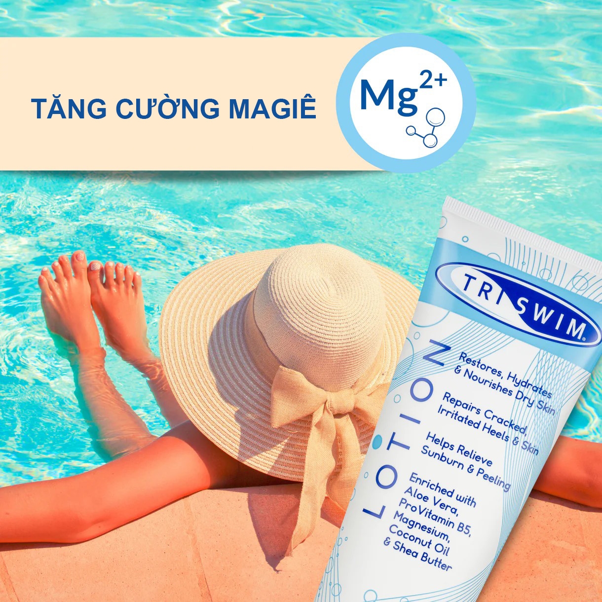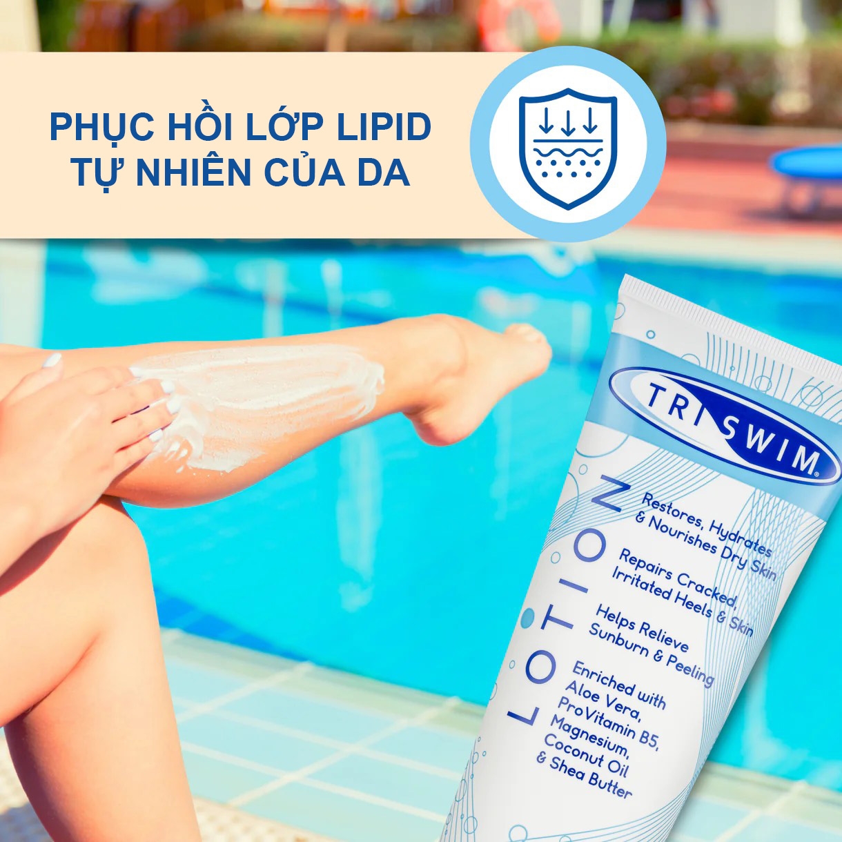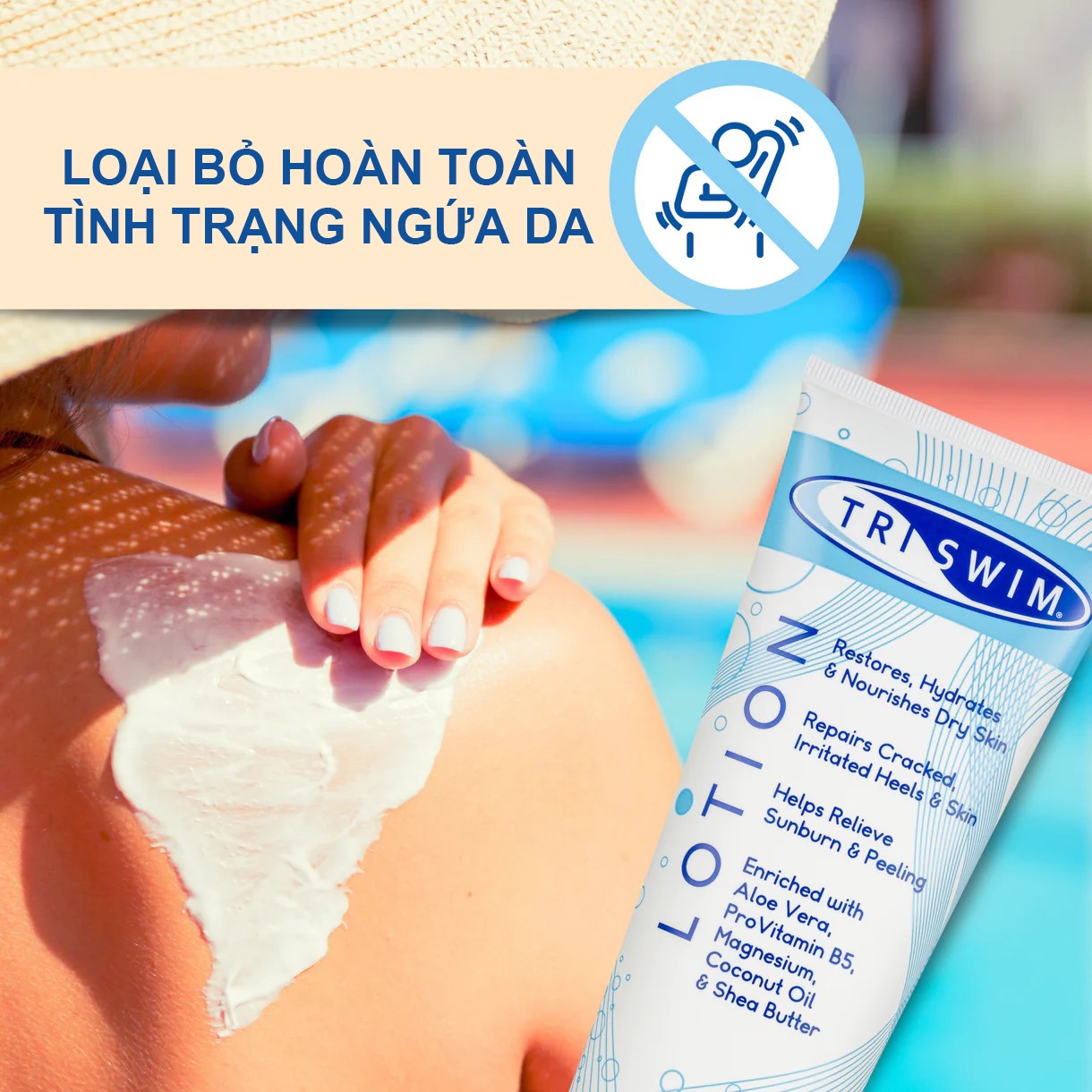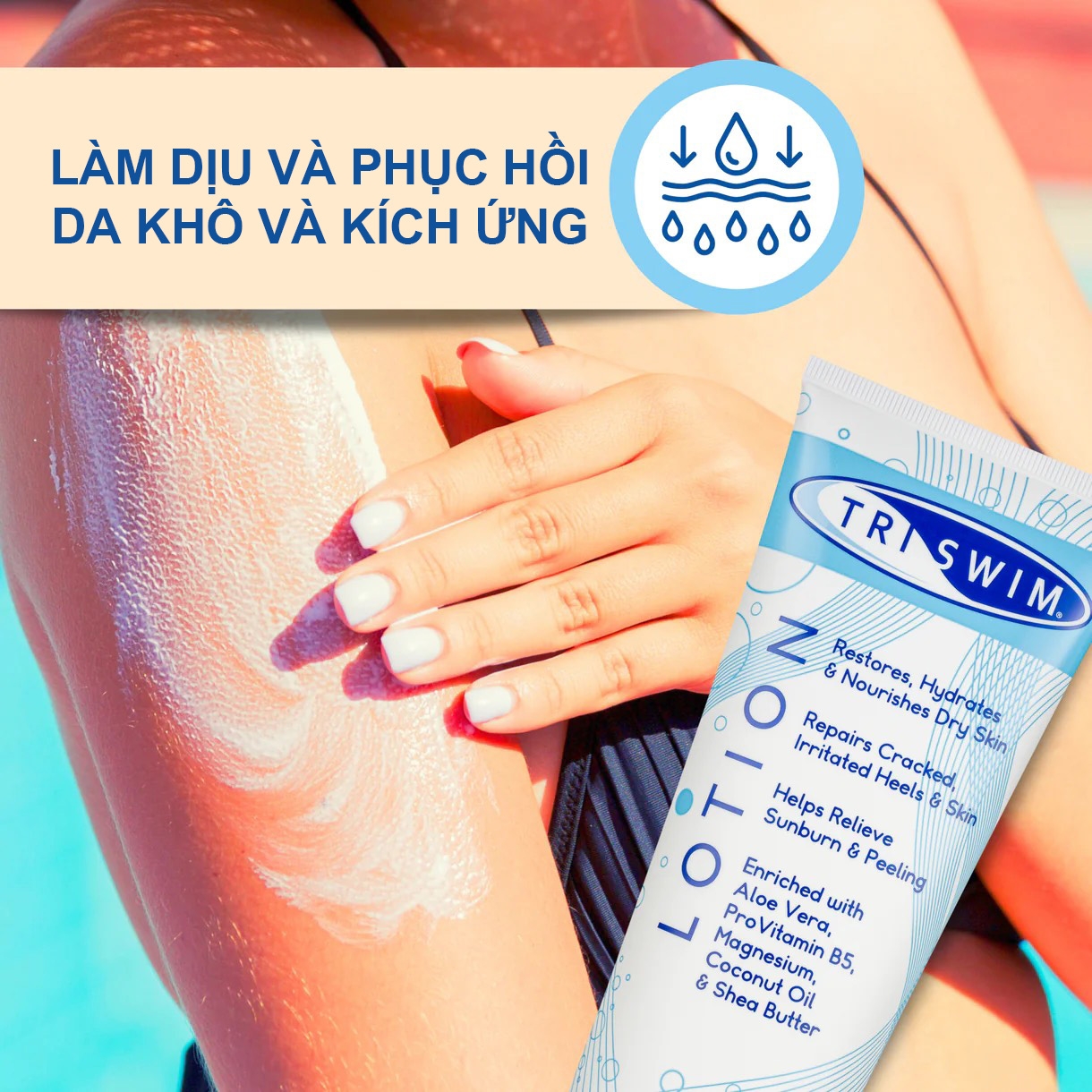 - Sữa dưỡng da TRISWIM LOTION có một công thức độc đáo và sáng tạo gồm hydrat và dưỡng ẩm da giúp trung hòa mùi hôi do Clo, Brôm và nước muối (Salt Water), ngoài ra TRISWIM LOTION chứa Aloe Vera sẽ hỗ trợ giữ ẩm và giúp bảo vệ khỏi các yếu tố môi trường. Vitamin E và Pro Vitamin B5 có khả năng xâm nhập vào da giúp dưỡng ẩm và chữa lành da